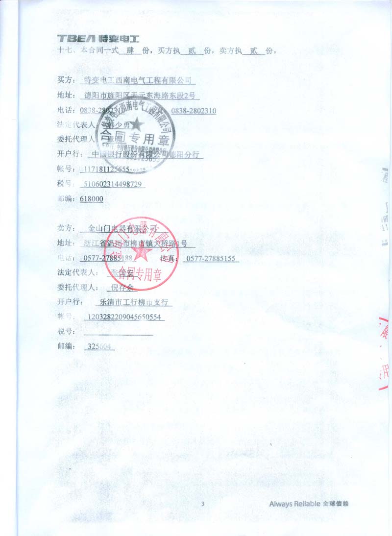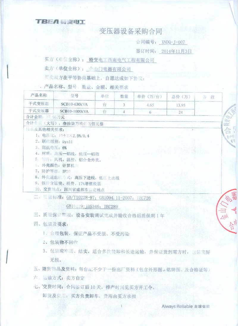 公司生產(chǎn)基地現(xiàn)有樂清,麗水及江蘇太倉三塊生產(chǎn)基地。公司擁有專業(yè)的技術(shù)骨干力量,專業(yè)生產(chǎn)10kv,35kv,110kv,220KV級的油浸式電力變壓器,10KV,35KV級的絕緣樹脂澆注干式變壓器,H級絕緣環(huán)保型干式變壓器,6kv,10kv級礦用移動(dòng)變電站,以及礦用油浸式三相變壓器,公司于2011年開始建成投產(chǎn)預(yù)裝式變電站,組合式變電站,風(fēng)能箱式變電站,高低壓開關(guān)柜及輸配電設(shè)備,年生產(chǎn)能力達(dá)1000萬KVA,產(chǎn)品廣泛使用于電力,鐵路,礦業(yè),船運(yùn)等領(lǐng)域。